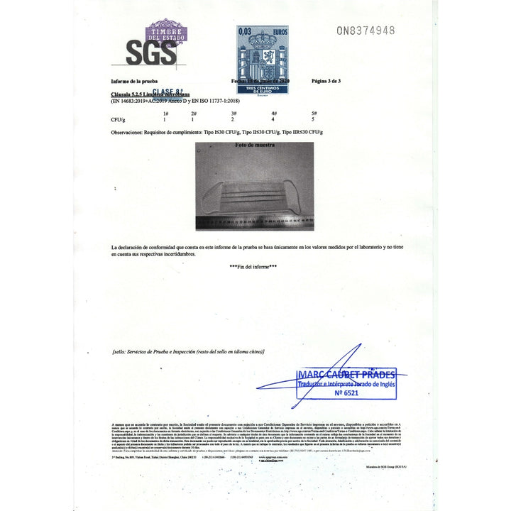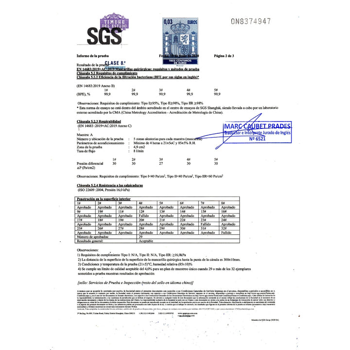 Ce masque chirurgical est de type IIR par rapport à son efficacité de filtration bactérienne. Il a une efficacité de filtration bactérienne de plus de 98%. Fabriqué conformément à la directive 93/42/CEE relative aux dispositifs médicaux selon la norme EN 14683:2019+AC:2019. Rapport de test approuvé par SGS et marqué CE.