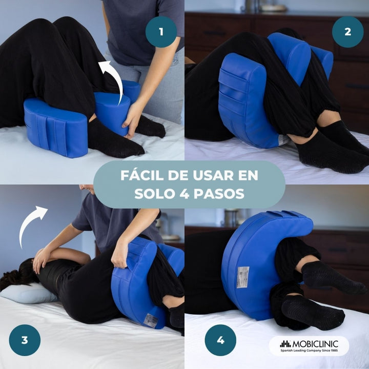 L'utilisation du coussin Folk est intuitive : il suffit de glisser les jambes du patient dans les fentes du coussin, de placer une main sur sa taille ou son dos et, de l'autre, de tenir l'une des poignées latérales pour faire pivoter facilement le coussin. Grâce à sa légèreté et à sa compacité , cette opération peut être réalisée à domicile, en établissement de soins ou en déplacement.