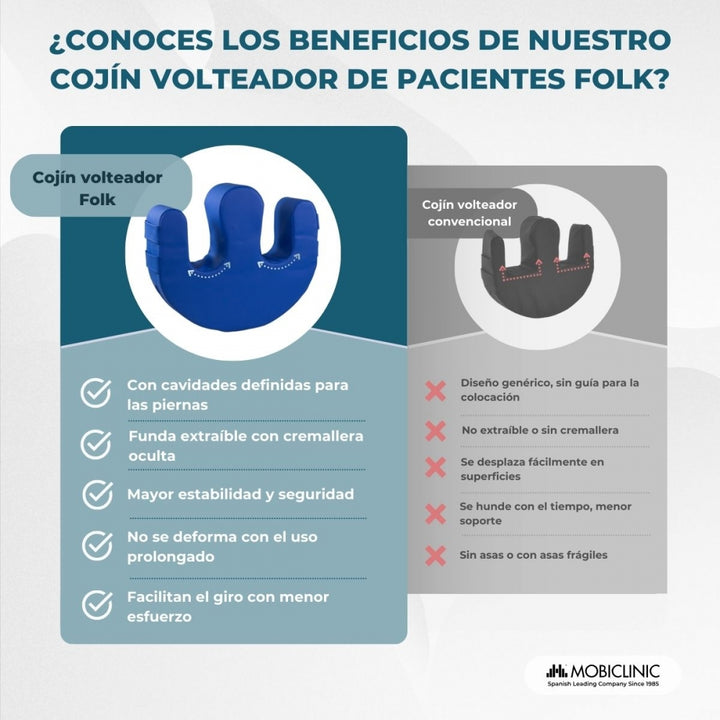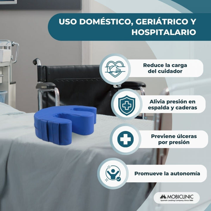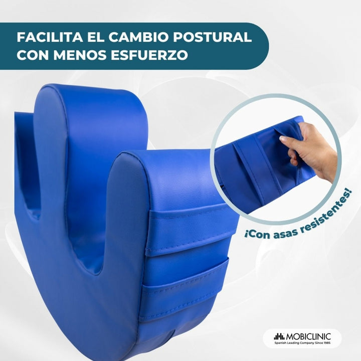 Le coussin de retournement Mobiclinic® Folk a été conçu pour améliorer la prise en charge des patients alités, facilitant les changements posturaux en tout confort et en toute sécurité. Sa forme en U, avec un séparateur de jambes arrondi et deux poignées latérales ergonomiques, permet au soignant de repositionner le patient sans effort, réduisant ainsi les efforts physiques et améliorant l'efficacité des soins quotidiens.