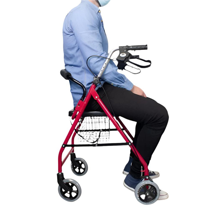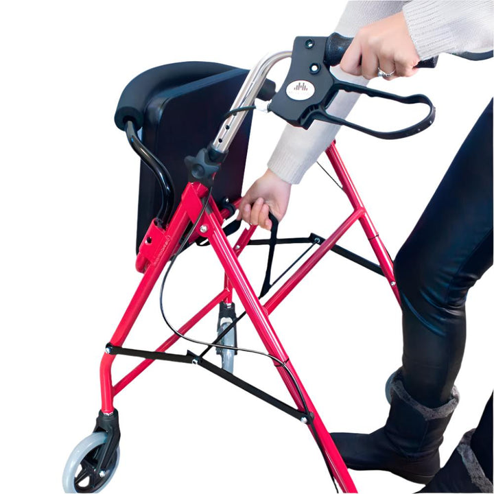 - Poignées ergonomiques réduisant la fatigue pendant l'utilisation. Elles sont équipées de freins pour arrêter en douceur le rollator 4 roues au bon moment et sans effort. Vous avez également la possibilité de laisser les freins verrouillés pour assurer l'immobilisation du déambulateur lorsque vous vous reposez sur le siège.