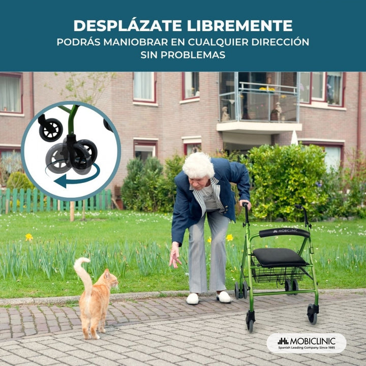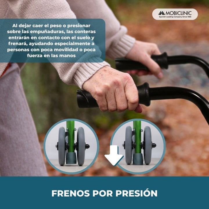 - Il est doté de deux roues avant pivotant à 360º, d'un siège confortable permettant à l'utilisateur de se reposer, d'un dossier rembourré et de freins activés par pression lors de l'exercice d'une force sur les poignées (en laissant tomber le poids du corps sur les poignées).