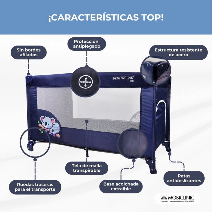 Le berceau portable Mofli est composé d'une structure en acier résistante et d'un tissu respirant qui permet une vision complète du bébé, facile à nettoyer avec un chiffon humide. Il fait office de parc grâce à sa hauteur fixe et sa ventilation optimale grâce à sa grille latérale. De plus, son pliage facile lui permet d'être transporté dans n'importe quel espace sans problème si nécessaire. Comprend également une base rembourrée amovible.
