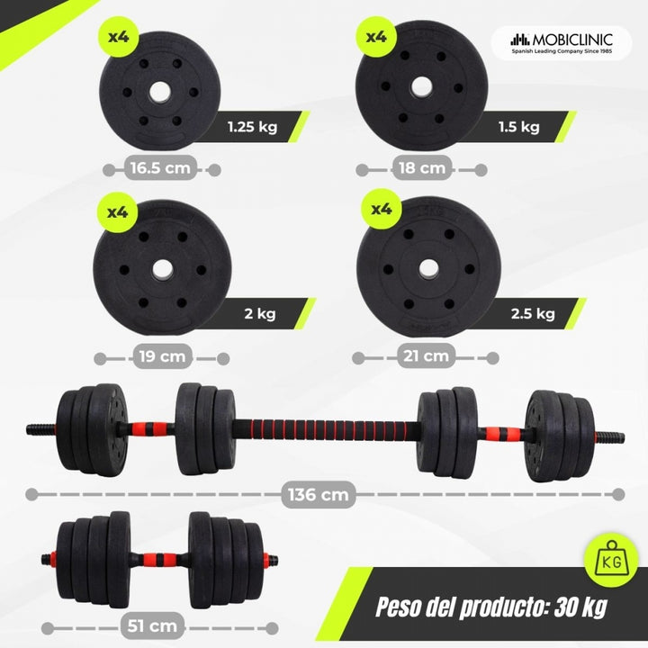 Cet ensemble a été conçu pour allier fonctionnalité, sécurité et confort. Son poids total de 30 kg (29 kg de disques + 1 kg d'accessoires) vous permet de personnaliser votre entraînement en ajoutant ou en retirant facilement des disques selon vos besoins. Outre sa fonctionnalité, cet ensemble se distingue par son design compact et compact, idéal pour s'entraîner à la maison ou en déplacement.