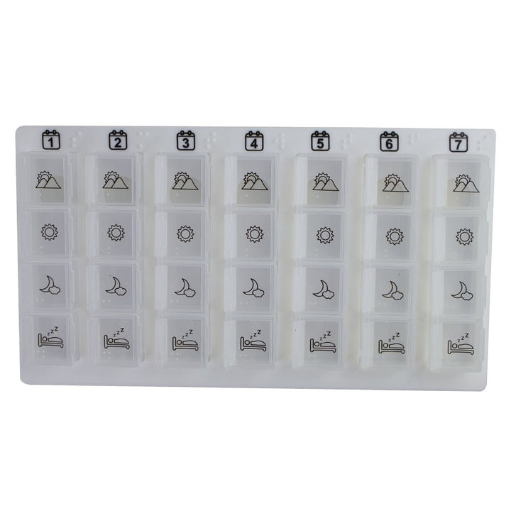 Chaque conteneur a quatre divisions avec l'icône de chaque moment de la journée, également représentée en braille. Ils correspondent au petit déjeuner, au déjeuner, au dîner et au coucher mais peuvent être adaptés aux besoins de chaque patient. Chacun des sept récipients peuvent être facilement transportés sous forme de pilulier individuel pour ne transporter qu'un seul comprimé par jour.