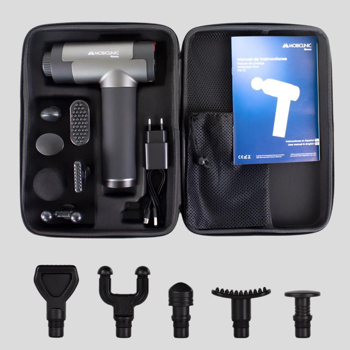 Il est très facile à utiliser, il suffit de retirer chaque tête et de la remplacer par celle que vous souhaitez utiliser à tout moment, de choisir le niveau d'intensité souhaité et d'appliquer le pistolet sur la zone que vous souhaitez détendre. En outre, son poids léger le rend parfaitement maniable et pratique pour que vous puissiez effectuer vos propres massages n'importe où.