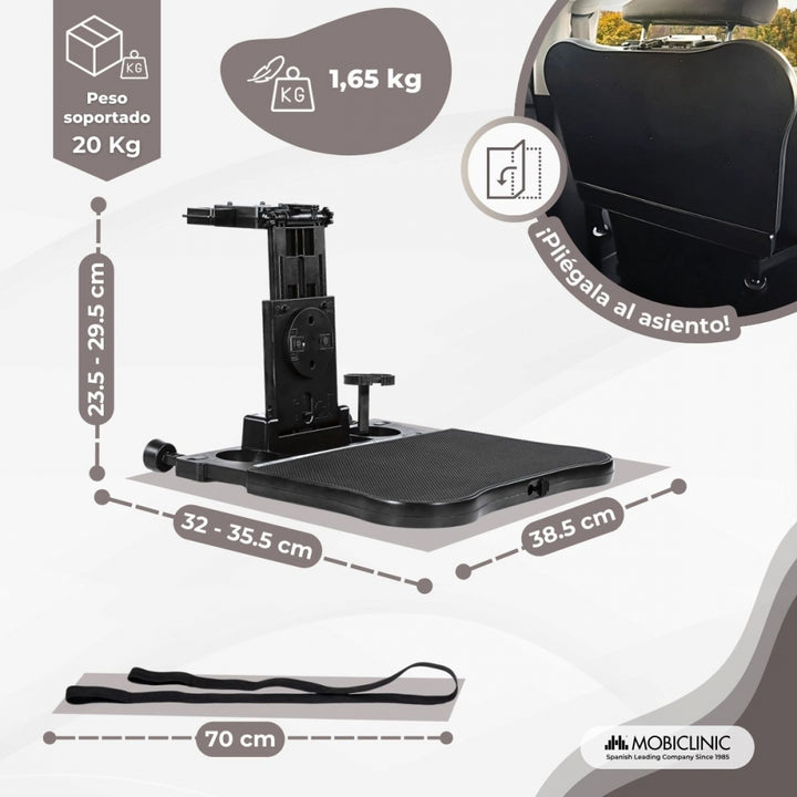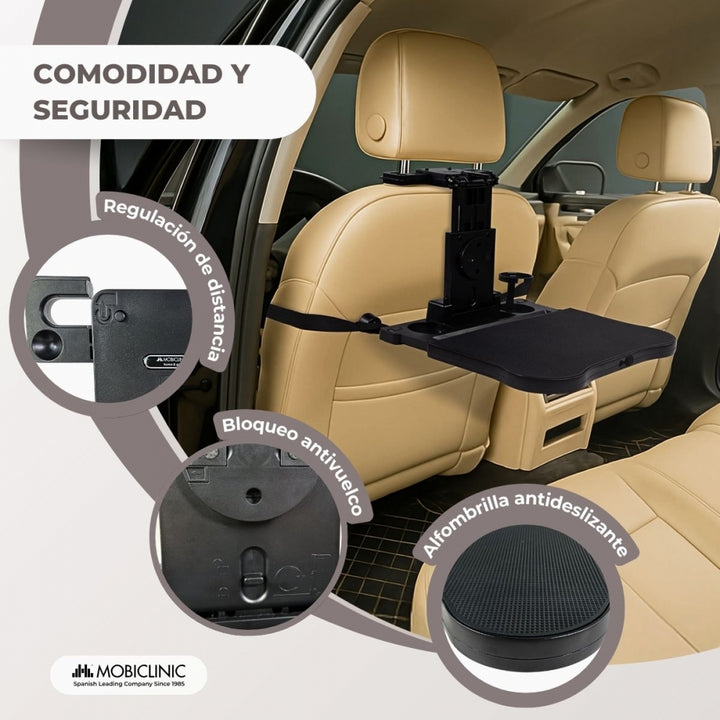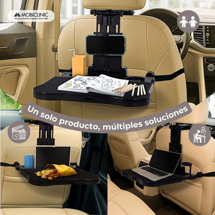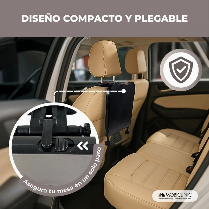 De plus, Staycar est pliable et réglable, ses supports s'adaptent aux différents modes d'assise, assurant une installation rapide et facile, et le plateau est fermement fixé au dossier du siège, empêchant tout type de mouvement indésirable. Grâce à sa conception pliable, il peut être facilement fermé lorsqu'il n'est pas utilisé, ce qui facilite son rangement et permet d'économiser de l'espace dans la voiture. Il dispose d'un système de verrouillage qui garantit que le plateau est bien fermé, empêchant ainsi son ouverture.