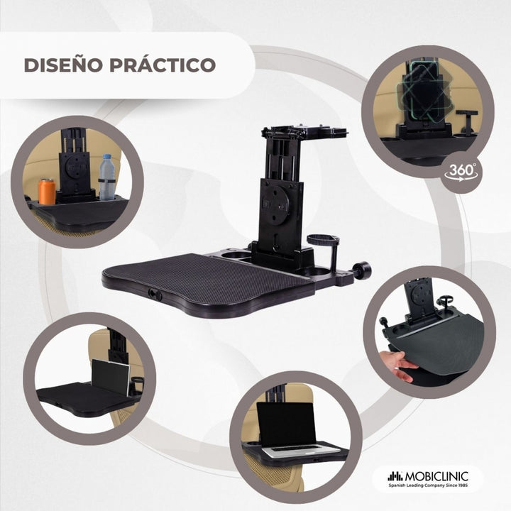 Cette table d'appoint offre non seulement un design fonctionnel, mais également divers accessoires qui améliorent l'expérience utilisateur. Un crochet 360º pour le téléphone mobile qui permet de placer l'appareil dans différentes positions. Ils comprennent également un emplacement spécialement conçu pour les tablettes, offrant un ajustement sécurisé qui maintient votre appareil en sécurité tout au long de votre voyage.