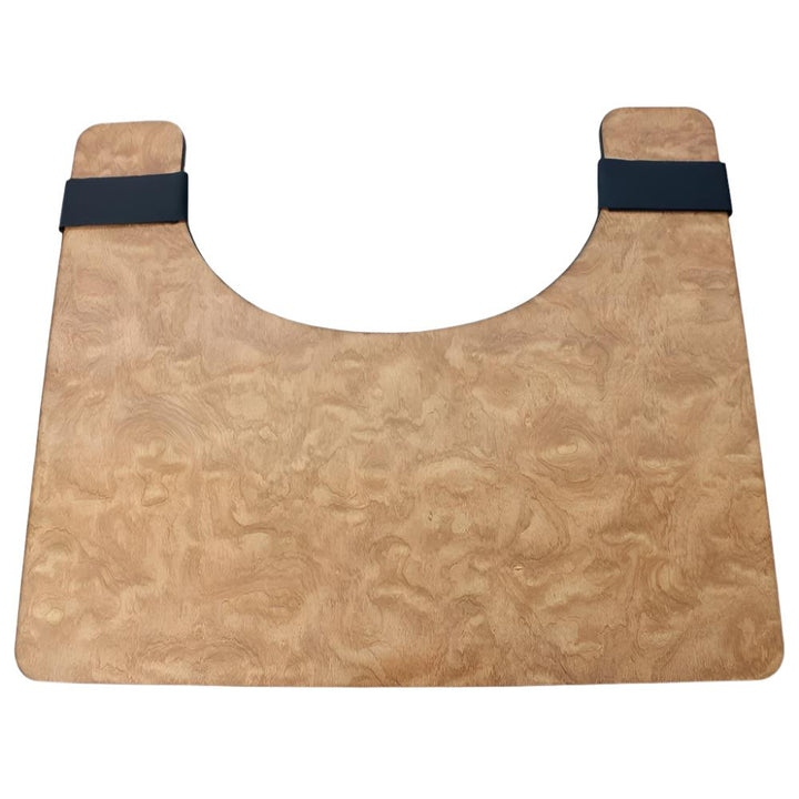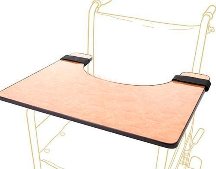 Ce plan de travail est fabriqué en aggloméré de 15 mm d'épaisseur de densité moyenne. Il s'adapte facilement à tous les types de fauteuils roulants grâce à ses sangles.