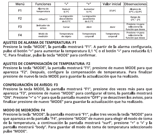 Il a la capacité d'enregistrer des températures corporelles entre 32º et 42,9º et dispose également d'une fonction d'alarme qui alerte en cas de fièvre si la température du patient est égale ou supérieure à 38º.
